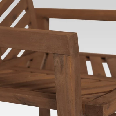 Find the ideal outdoor chat set for your living experience with this three-piece solid wood collection from Saracina Home. It includes two separate chairs with contoured seating and a bold chevron pattern that’s featured on the chairs and accompanying square side table. Made of solid acacia wood, this naturally weather resistant outdoor set is a perfect fit for front porches, backyard patios, or in the middle of a French garden. However your yard looks-or you want it to look-this conversation set is the addition you’ve been waiting for. Properly care for your outdoor acacia furniture by keeping it out of severe weather conditions and applying teak oil every 2-3 months.