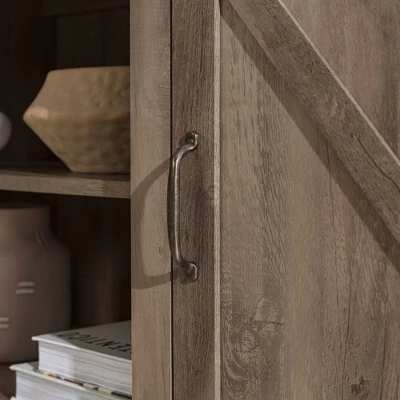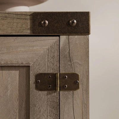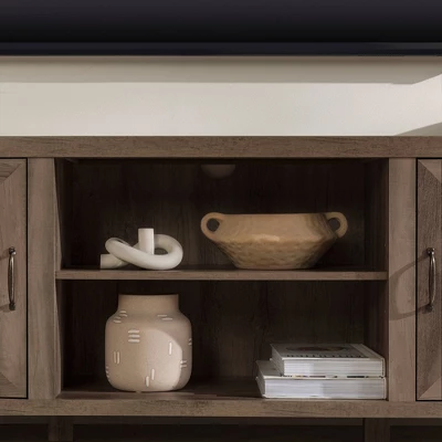 With barndoor inspired cabinet fronts, this storage console from Saracina Home has a modern farmhouse style for a charming, country feel to your home. Center shelving with cable management features in back offers an easy spot for organizing your electronics. Adjustable shelving provides you the ability to fit items you need. Metal corners and door hinges complement the design style of this entertainment center. This TV stand is designed from high-grade MDF and laminate. Can support up to a 80-inch TV.