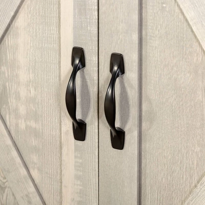 Create a modern farmhouse element in your home with this entertainment center from Saracina Home. The charming barn door inspired cabinets move along a metal track to display in the center or side with shelving for open and closed storage space. This high-grade MDF and laminate storage console features a wood grain finish for a rustic addition to your home. Perfect for your living room or bedroom to store books, electronics, media, and décor. Decorate the table top with an array of plants or for your TV up to 65-inches.