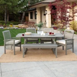 Ravenscroft 6pc Acacia Wood Patio Dining Set With Bench – Gray Wash – Saracina Home